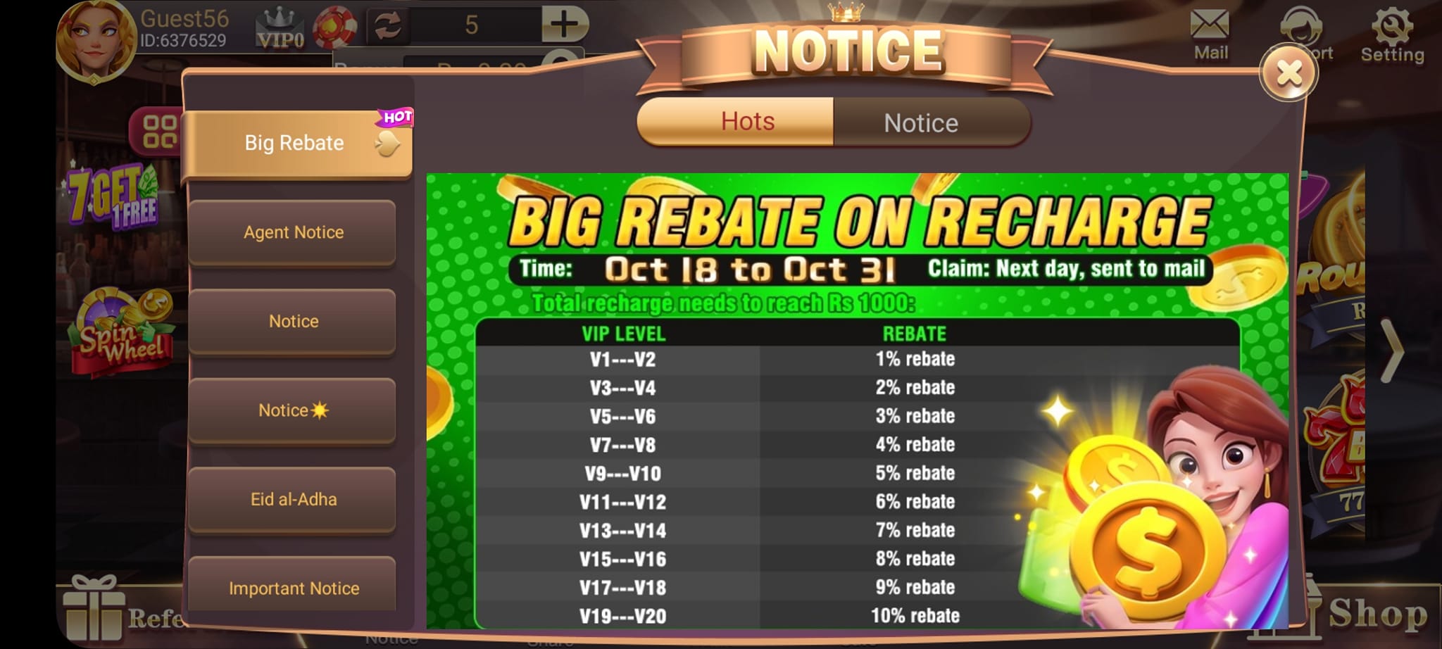 The refer and earn option allows users to invite friends and family to join the platform. For every new user who registers and deposits money through your shared link, you can earn up to 1000 PKR. It is one of the easiest and most effective ways to build passive income through gaming.